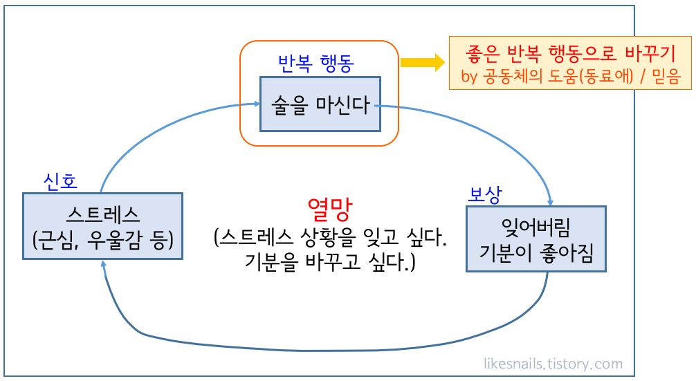 이 책에서는 알코올 중독자들의 치료 모임인 AA(Alcoholics Anonymous)모임을 예로 들었습니다.