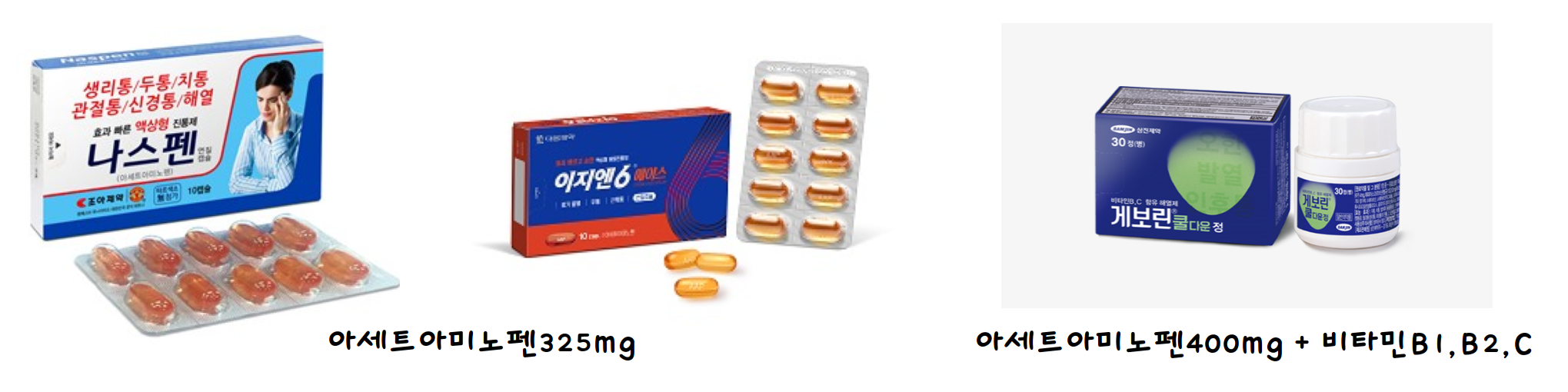 최근엔 아세트아미노펜 325mg의 연질캡슐 제품이 많이 나와 있습니다.