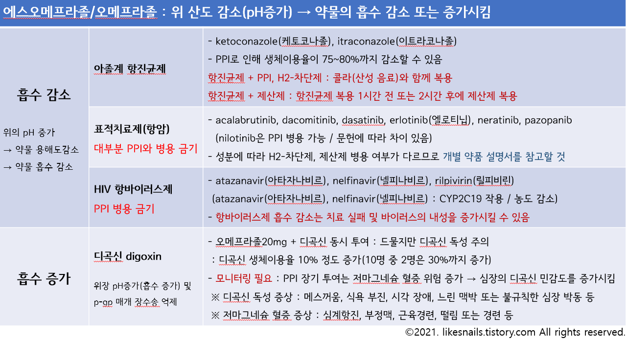 1) 이 약 투여 중 위내 산도 감소로 인해 위 산도에 의해 흡수 기전이 영향을 받는 약물의 흡수가 증가 또는 감소될 수 있다. 다른 산 분비 억제제나 제산제와 마찬가지로 이 약 투여 중에는 케토코나졸과 이트라코나졸 및 엘로티닙의 흡수가 감소될 수 있고 디곡신의 흡수가 증가할수 있다.