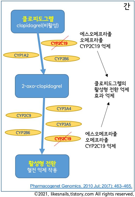 활성형 전환에 필요한 여러 효소들 중 CYP2C19가 에스오메프라졸/오메프라졸에 의해 억제되면 클로피도그렐의 효과가 저하될 수 있어 병용하지 않도록 하고 있습니다. (H2-차단제나 제산제 사용 권고)