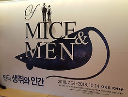 연극 - 생쥐와 인간 1차 관람 : 2018년 8월 5일 오후 6시 캐스팅 : 문태유, 최대훈, 손지윤, 김지휘, 김대곤 2차 관람 : 2018년 9월 9일 오후 6시캐스팅 : 이우종, 양승리, 손지윤, 육현욱, 김대곤 하지만 생쥐야, 앞날을 예측해 봐야 소용없는 건너만이 아니란다.생쥐와 인간이 아무리 계획을 잘 짜도일이 제멋대로 어그러져고대했던 기쁨은 고사하고슬픔과 고통만 맛보는 일이 허다하잖니!로버트 번스 '생쥐에게 To a Mouse' 중에서 / '생쥐와 인간'(비룡소) 중 이 작품의 원작 소설의 처음 제목은 'Something That Happened ' 즉 '일어난 일' 이었다고 한다.하지만 영국시인 '로버트 번스'의 시 '생쥐에게'를 읽은 후,소설 제목을 '생쥐와 인간(Of Mice and Men)'으로 바꾸었다고..